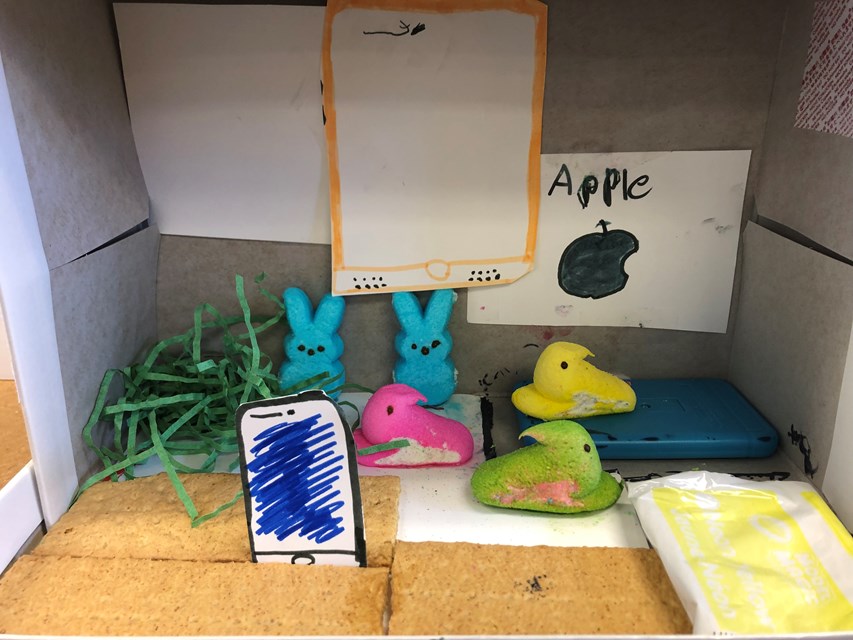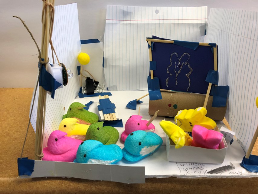 Eli’s project triggered a discussion with some students on if computer scientists were really “scientists.” Eli also struggled with scale in his project. He had a little pretend phone but when set next to a Peep, it was enormous. He had to determine if using the prop was more important than trying to stay in scale. I thought this was an interesting problem that I hadn’t anticipated. (Read Eli’s essay here.)