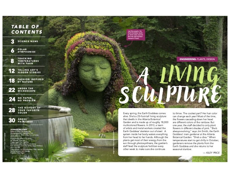 Some of the stories explore how science emerges from art, such as the materials that gave ancient works their range of hues (“The History of Your Favorite Color”) and a profile of an artist whose creative medium—a type of magnetic liquid called a ferrofluid—serves as a launchpad to explain physics concepts (“Under the Microscope”). Others highlight ways that art and science can work together to shape peoples’ experiences of both. “Tracking Temperatures with Yarn” explores artistic representations of climate change, and “Feel the Opera with Your Shirt” describes the technology behind a sensor-studded shirt that translates sounds into vibrations so deaf people can feel music.