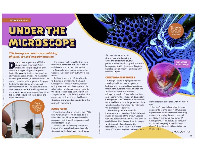 Alice: You can use grids [that are part of design software] to break things up into columns and rows and then arrange stuff on the page. It’s a way to provide structure to organize text, images, etc. on a page in a way that’s easy for a reader to follow. And then I really just had fun with different fonts, colors, textures, and shapes. One spread I’m specifically thinking about is “Under the Microscope.” All the ferrofluid stuff is abstract shapes and these blobs and things. And I was like, what if we play with that [for shapes in the layout]? And then in terms of color, using what’s in the images to build a color palette.