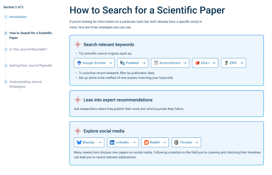 In both options, we’ll walk users through 10 common reporting situations and point them to the specific advice and resources they need. For example, our lesson on finding scientific papers will help you search for papers on any topic, navigate journal paywalls, vet journals, and understand how embargoes work.